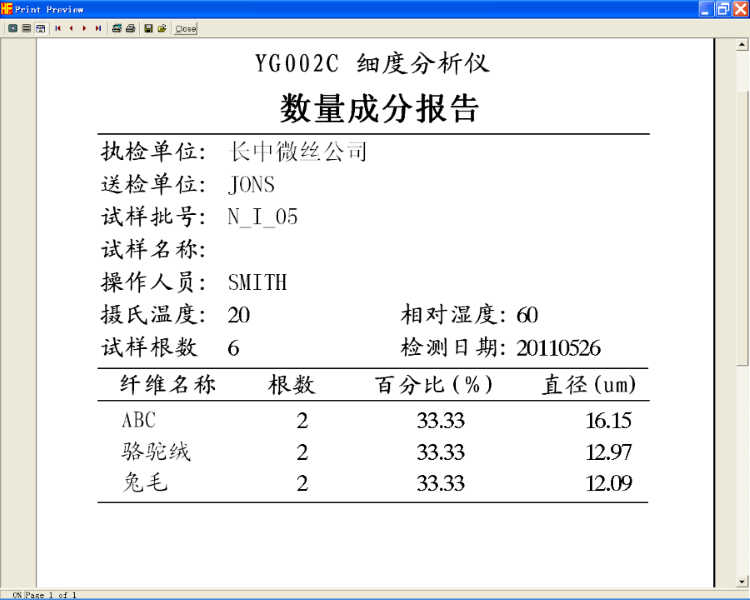 對(duì)于成分分析報(bào)告,點(diǎn)擊【打印機(jī)預(yù)覽】按鈕,可看到以下打印頁(yè)面:
